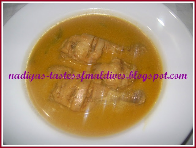 add the marinated chicken, Maldivian chilly, coconut milk & salt per your taste cook until chicken is tender. Serve with Roshi or Plain rice..........................enjoy